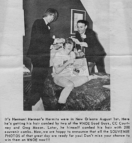 C.C. Courtney & WNOE Program Director Greg Mason combing Peter Noone's (Herman's Hermits) hair.
